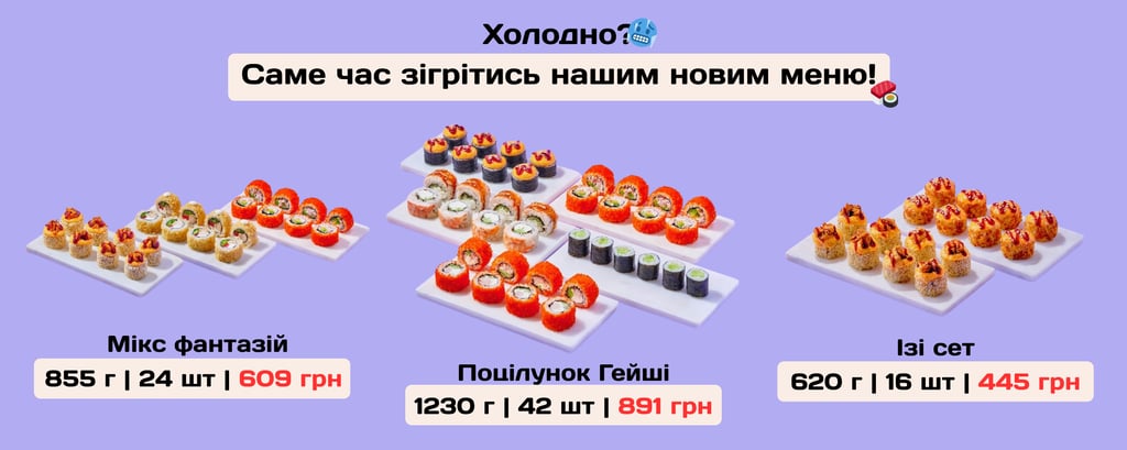 Філадельфія з тигровою креветкою, Каліфорнія з окунем, Каліфорнія з крабом, Запечений з манго, Макі огірок