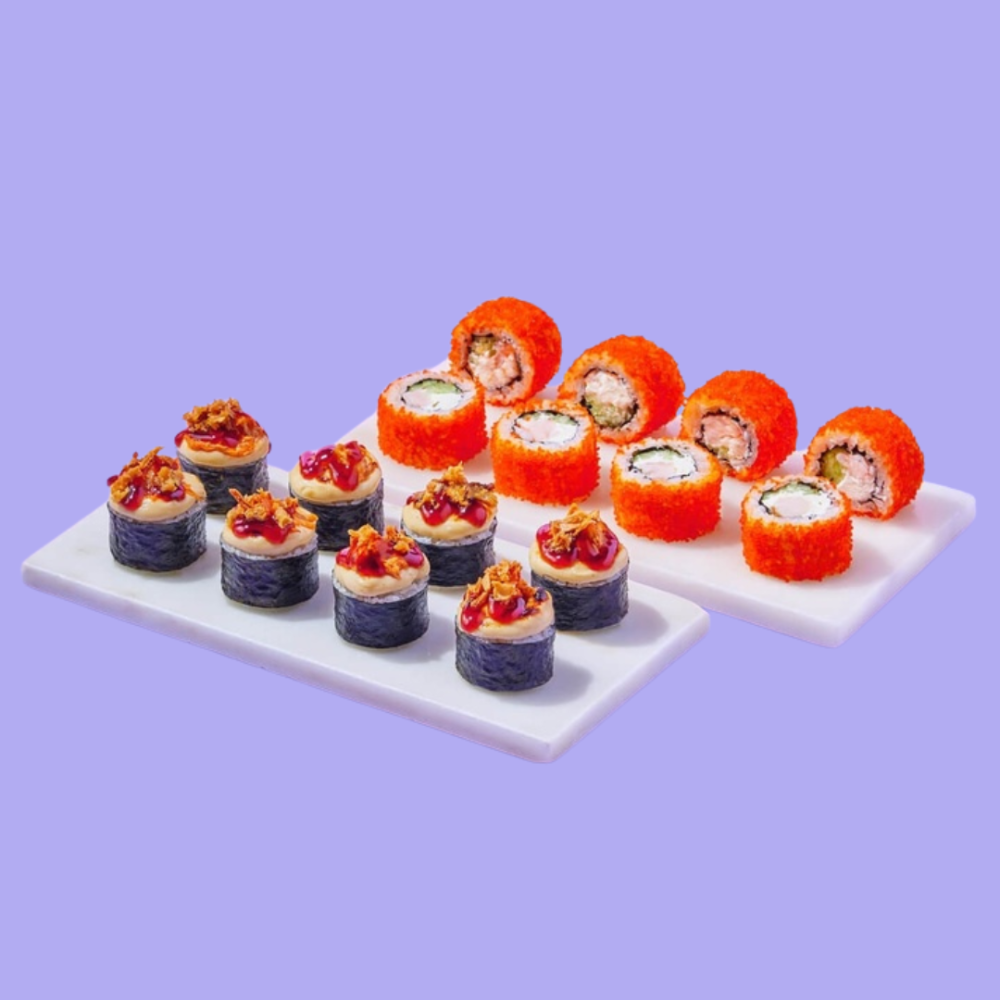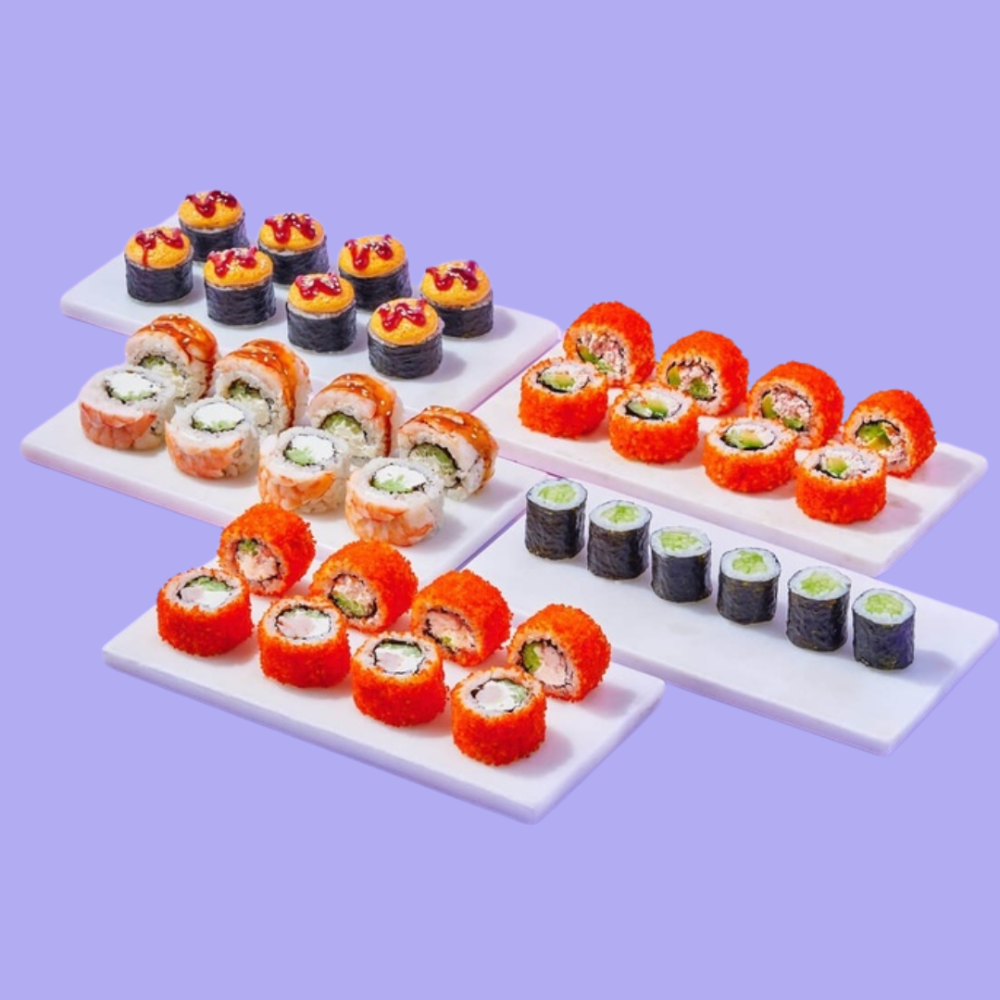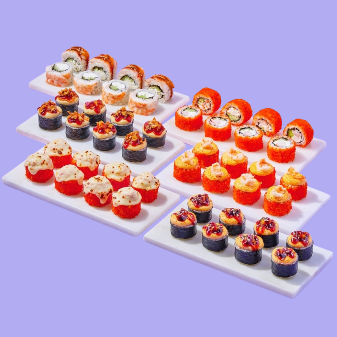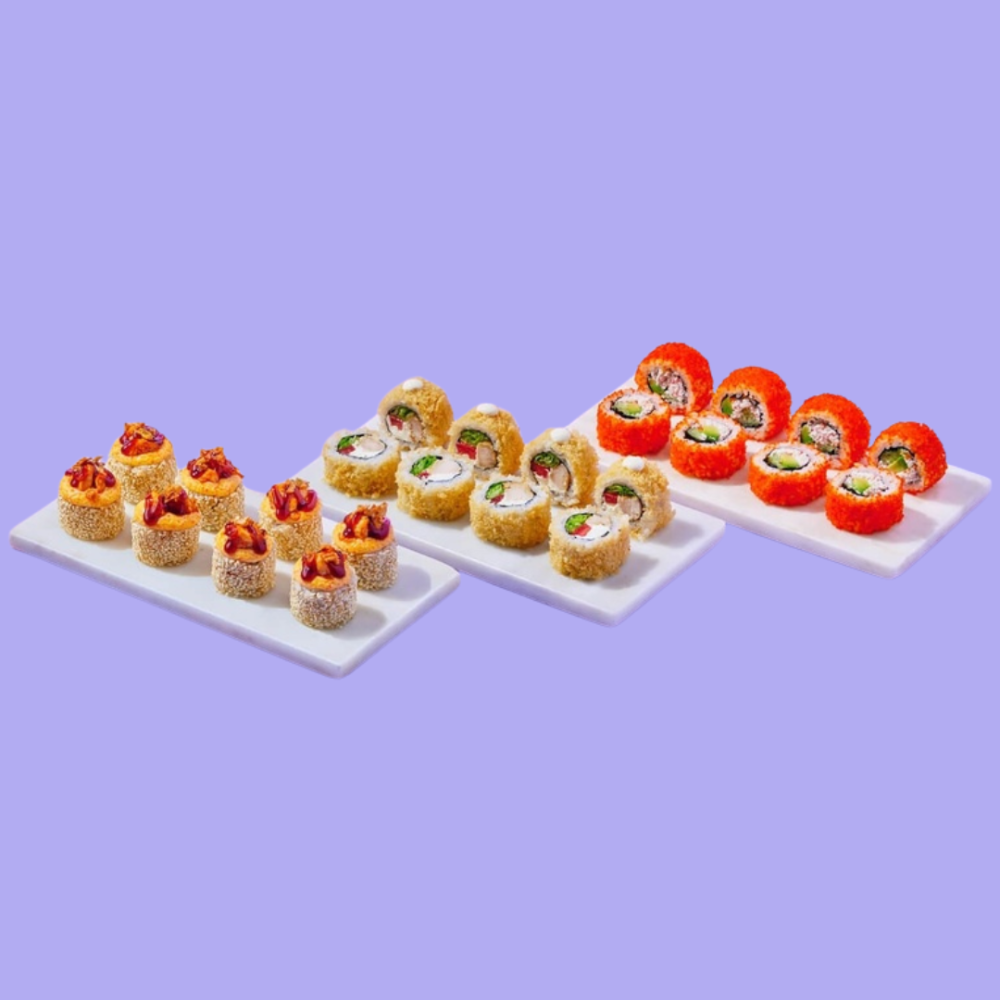 Філадельфія з креветкою, Каліфорнія з крабом, Запечений рол з креветкою, Запечений сирний рол, Запечений з морським окунем, Запечений з манго